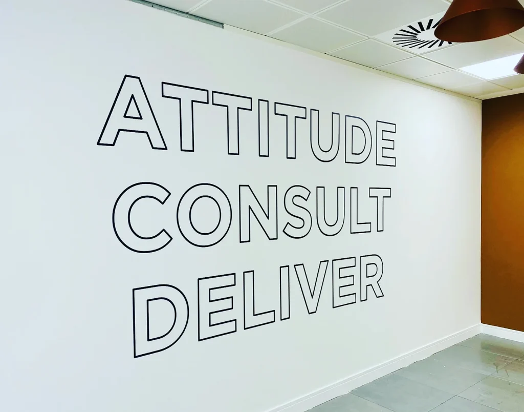 Our ‘Printed Wall Graphics‘ service covers the broadest range of custom visual solutions. This category includes everything from bespoke die-cut shapes and motivational quote graphics to textured finishes and fabric-backed wall coverings. It’s the flexible option for non-mural visual communication, perfect for temporary campaigns, directional signage, or adding creative flair to specific areas like stairwells and break-out zones. We advise on the best material (matte, gloss, textured, removable) based on your wall type, ensuring maximum impact and longevity. A dynamic and adaptable way to reinforce your brand across any UK commercial space.