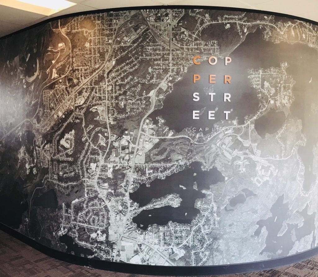 We produced and installed a high-resolution map graphic that wraps seamlessly around the curve of the wall, creating a smooth, continuous visual flow. The printed vinyl was installed with precision to maintain clarity and alignment across the entire surface.